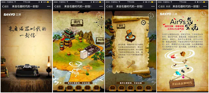 联想到古人的洗衣方式劳累、效率不高,而今三洋超越传统,用科技焕新生活,文呈国际策划小组创意推出“来自石器时代的一封信”H5,以寻宝的方式科普了我国洗衣历史发展进程。单日H5浏览量即达8万,转发比例高达三成,并通过各大新闻门户、微信大号、新浪微博大号及话题榜等渠道传播,微博曝光量4507371次、微信曝光量213945次。
